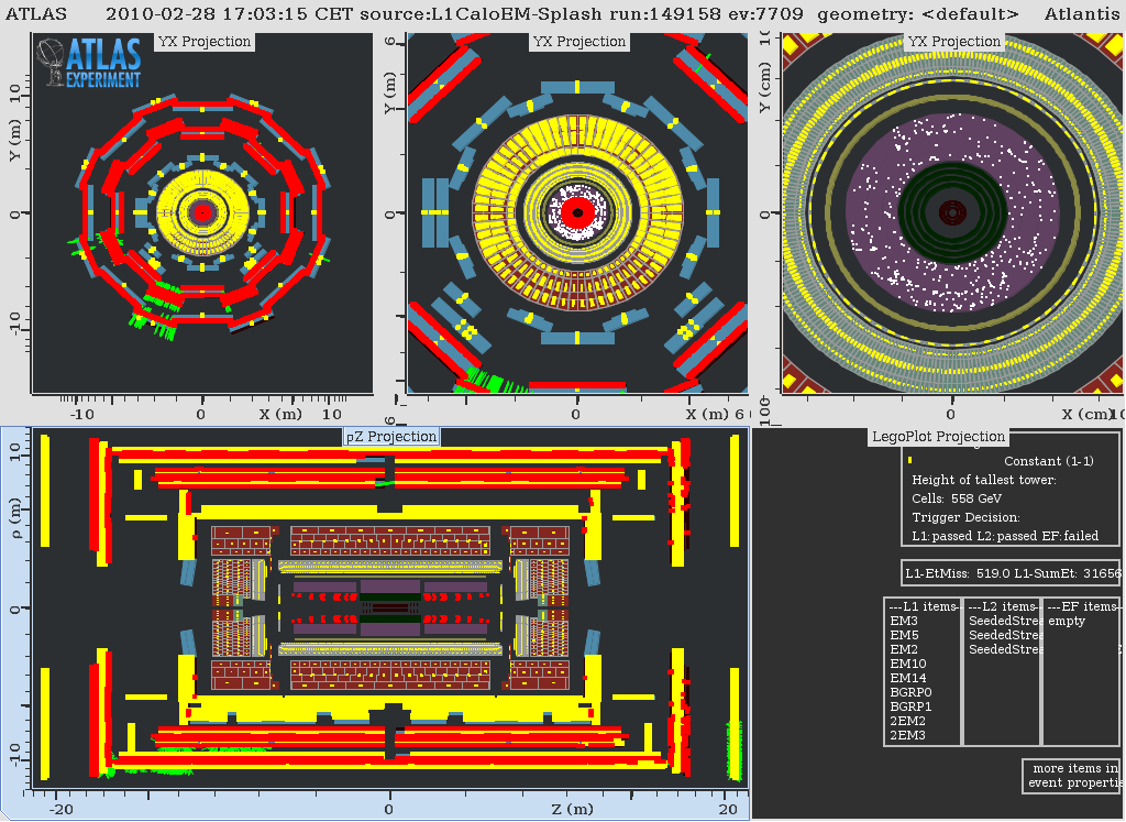 At approximately 2:40 am Central European Time, ATLAS saw particles from the LHC for the first time in 2010. As in previous LHC turn-on periods the first thing we see are beam splashes from the LHC beams as they slowly thread the beam through the LHC ring for the first time.