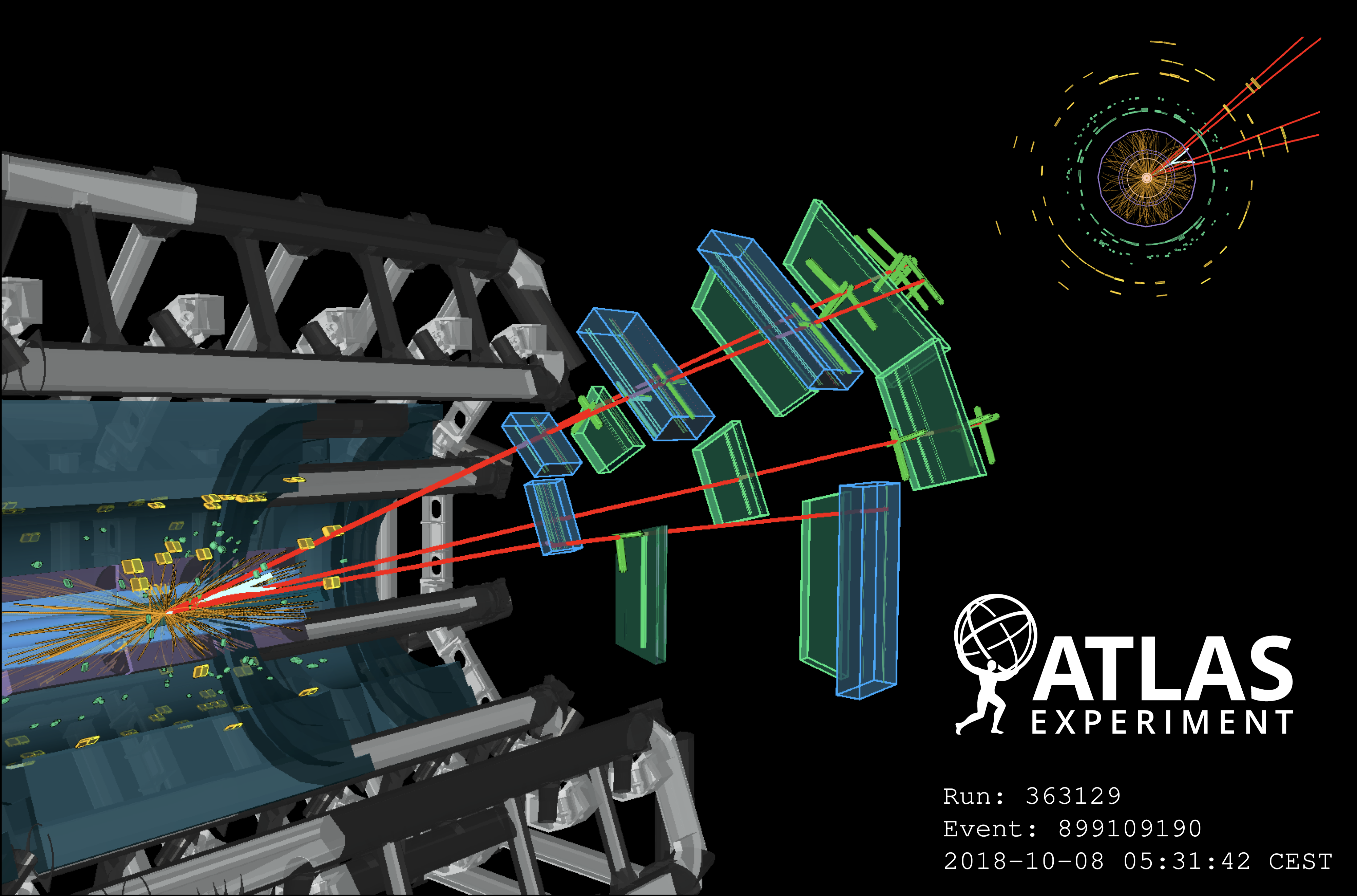 The H→cc and H→bb decays lead to very similar signatures in the ATLAS detector, as shown in the event display. In both cases, the quarks from the Higgs-boson decay hadronise, which causes collimated sprays of particles called “jets”. Researchers are able to distinguish the b-jets of H→bb from the c-jets of H→cc by analysing the constituents of the jets, looking for the traces of b- or c-hadrons. With the help of machine-learning algorithms, the jets can be classified as originating from a beauty quark, a charm quark or something else.